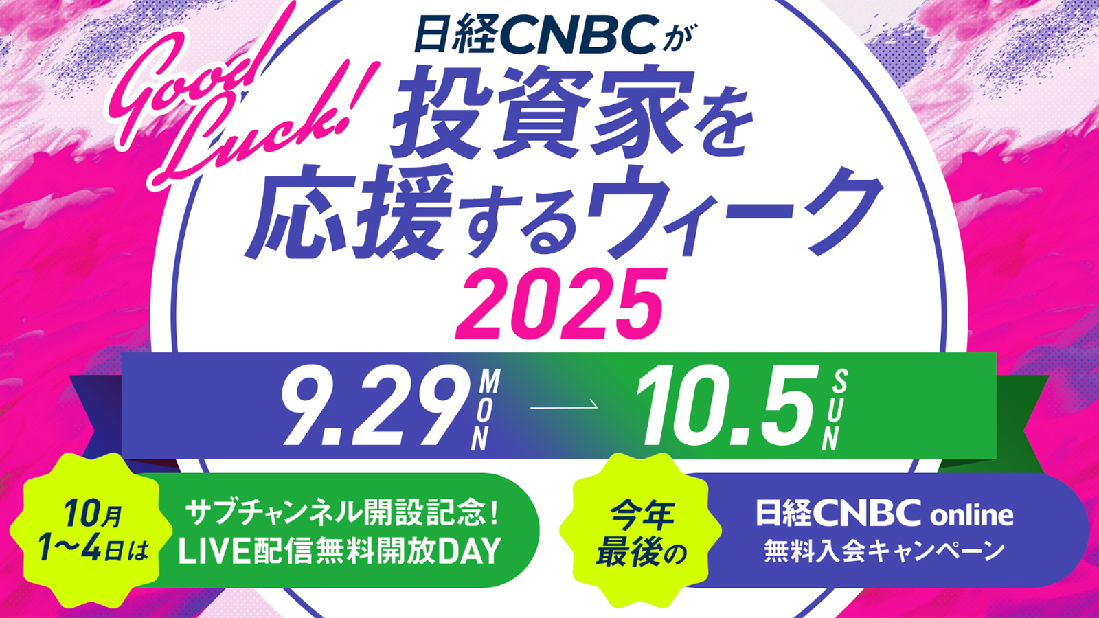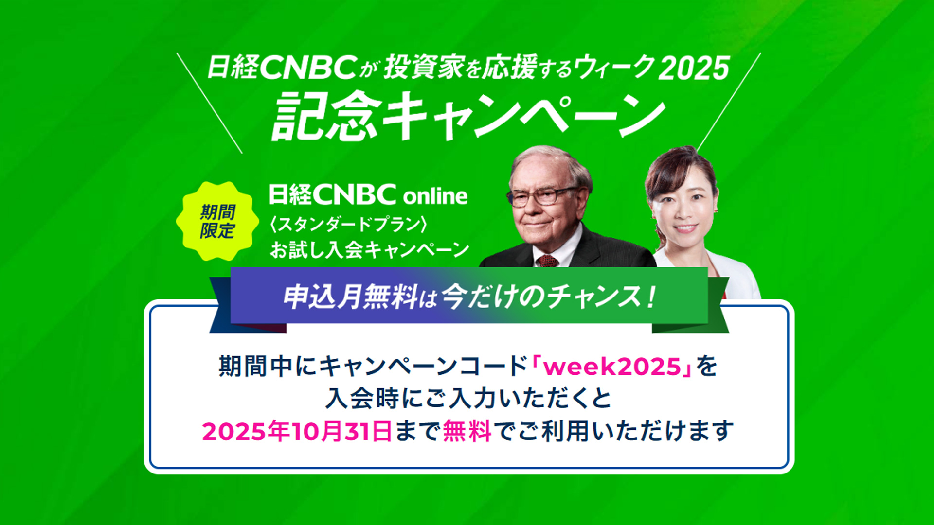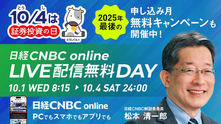 「投資家を応援するウィーク2025」では「日経CNBC online」への入会を検討中の皆様に向け10月末までの視聴料が無料となるキャンペーンを用意しております。本イベントをきっかけに「日経CNBC online」をお試しください!