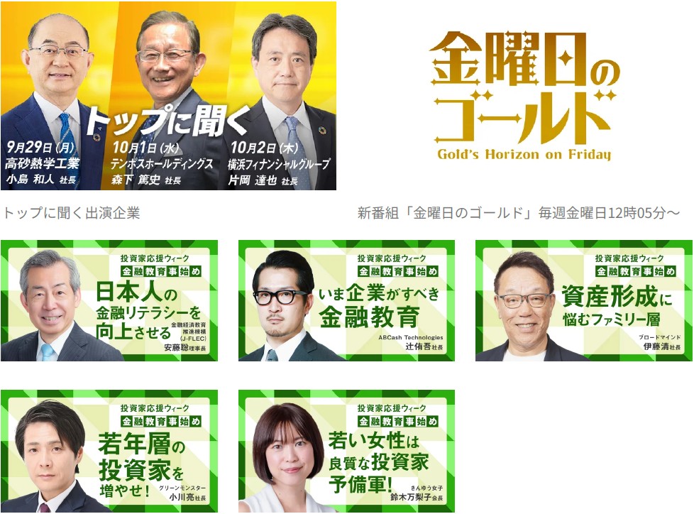 なかでも10月3日は朝エクスプレス には日本証券業協会日比野隆司会長が登場。昼エクスプレスのゲストコーナーでは投資家応援WEEKの特別テーマ「金融教育事始め」としてきんゆう女子 鈴木万梨子会長が出演 。