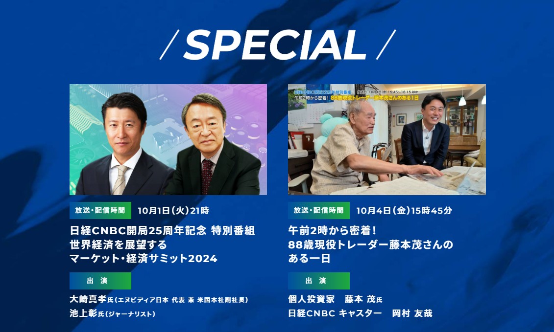 また、「証券投資の日」特別番組「午前2時から密着!88歳現役トレーダー藤本茂さんのある一日」を配信。米CNBCによるNY市場のLIVE配信では、注目の「米雇用統計速報」(英語放送)も予定しています。
