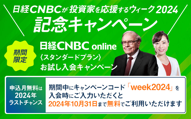 「投資家を応援するウィーク2024」では有料インターネット配信サービス「日経CNBC online」への入会を検討中の皆様に向け10月末までの視聴料が無料となるキャンペーンを用意しております。本イベントをきっかけに「日経CNBC online」をお試しください!