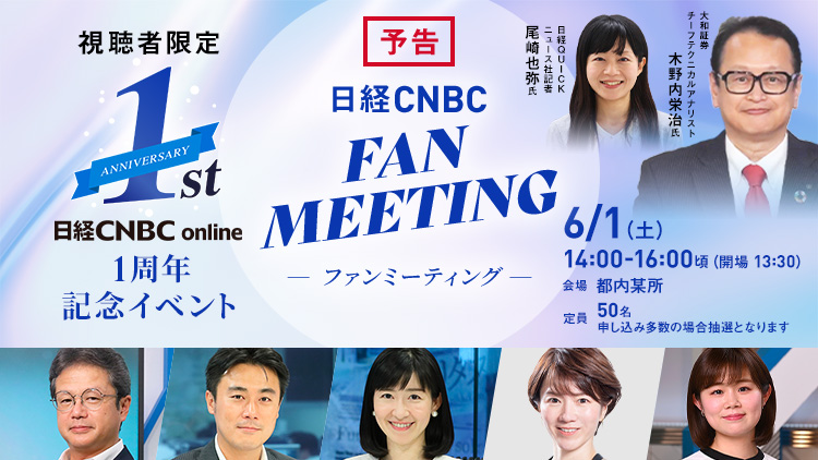 「日経CNBC」をご利用の皆様に向けた特別なイベントの開催を6月1日(土)に予定しております。ゲストは、大和証券 木野内栄治さんと日経QUICKニュース社の尾崎 也弥さん。その他、ファンの皆様におなじみの日経CNBC出演者が登場します。ここでしか聞けないゲストや出演者の話をじかにお楽しみください。詳細は4月15日(月)に、日経CNBCのホームページでお知らせします。