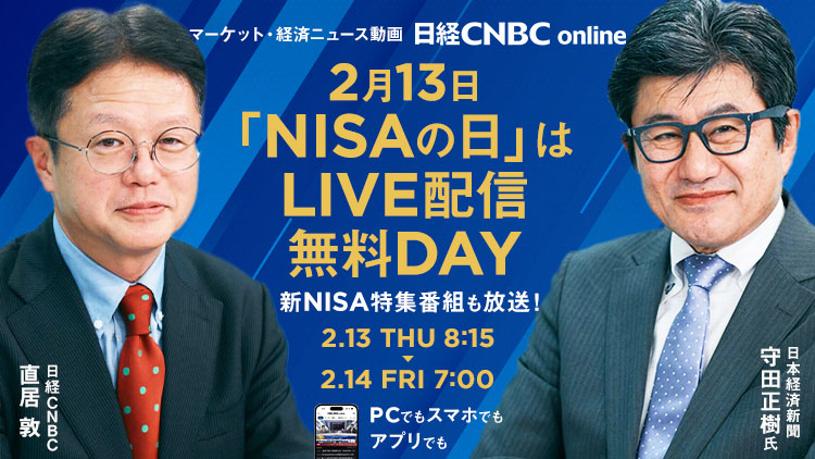 2月13日(木)の「NISAの日」を記念して「日経CNBC online」のライブ配信を無料開放いたします。無料開放は2025年2月13日(木)8:15から2月14日(金)7:00まで。投資やマーケットに興味がある方に向けた、ここでしか聞けない役立つ情報が東京市場のスタート直前からNY市場の大引け後まで無料で視聴いただけます。