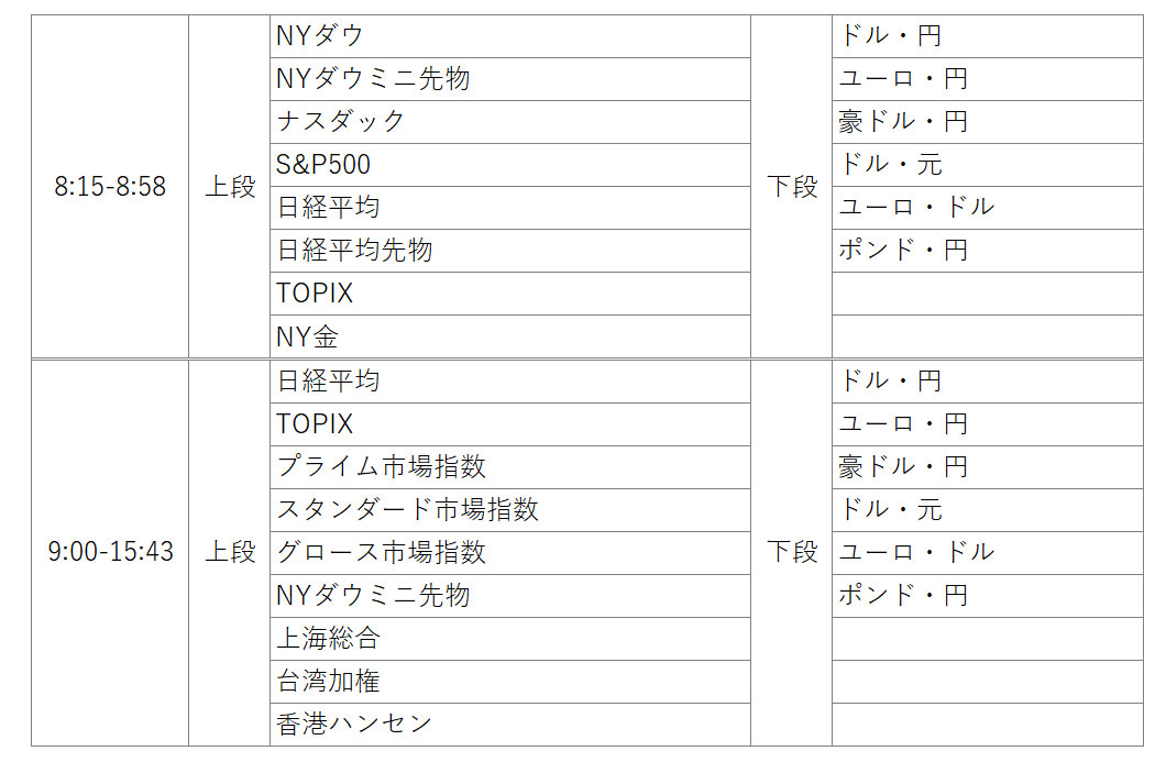 ②現在、8:15~8:58に表示している日経平均先物指数を、9:00~15:43にも表示します。
