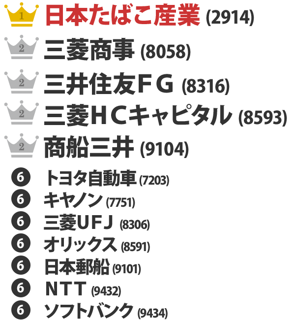 ・配当利回りが高く、同じく高配当株である商社と違い、景気に業績が左右されることなく一番安定している。業界が食料品分野に属しディフェンシブであるというのも魅力的です。機械的に配当再投資し複利を実感できる銘柄だと思います。(よしえどん)