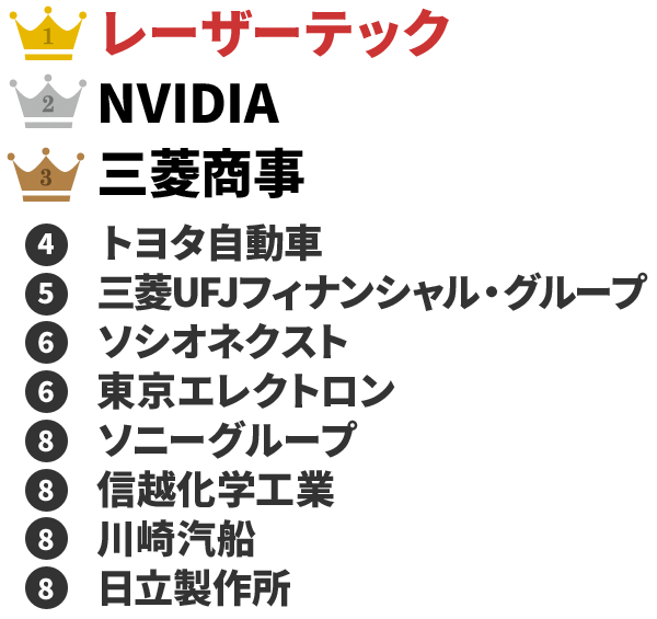 ・印刷会社の殻を突破し、株価は2倍。上場来の高値を更新し、時価総額はライバル大日本印刷を抜いた。リクルート株売却も大きかった。今後もパワー半導体関連企業として期待できる。富士フイルム同様、構造改革成功企業としてもてはやされるかもしれない。(くまぞう)