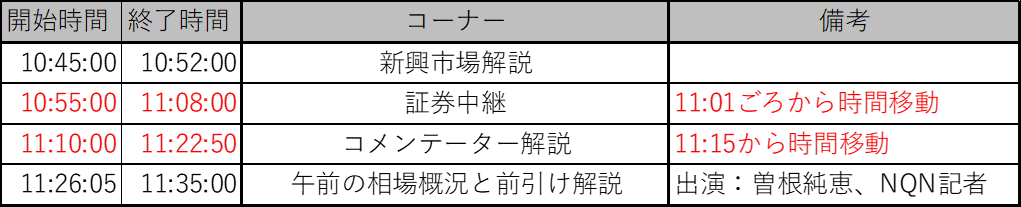 変更内容:午前の取引前後の模様は、「昼エクスプレス」でお馴染みの曽根純恵と日経QUICKニュース(=NQN)の記者がお伝えします。広い視点で東京市場の動きを追う曽根キャスターと、国内外の金融市場や上場企業などのニュースをリアルタイムで報道するNQNの記者による深いマーケット解説を視聴者の皆さまに毎日お届けします。