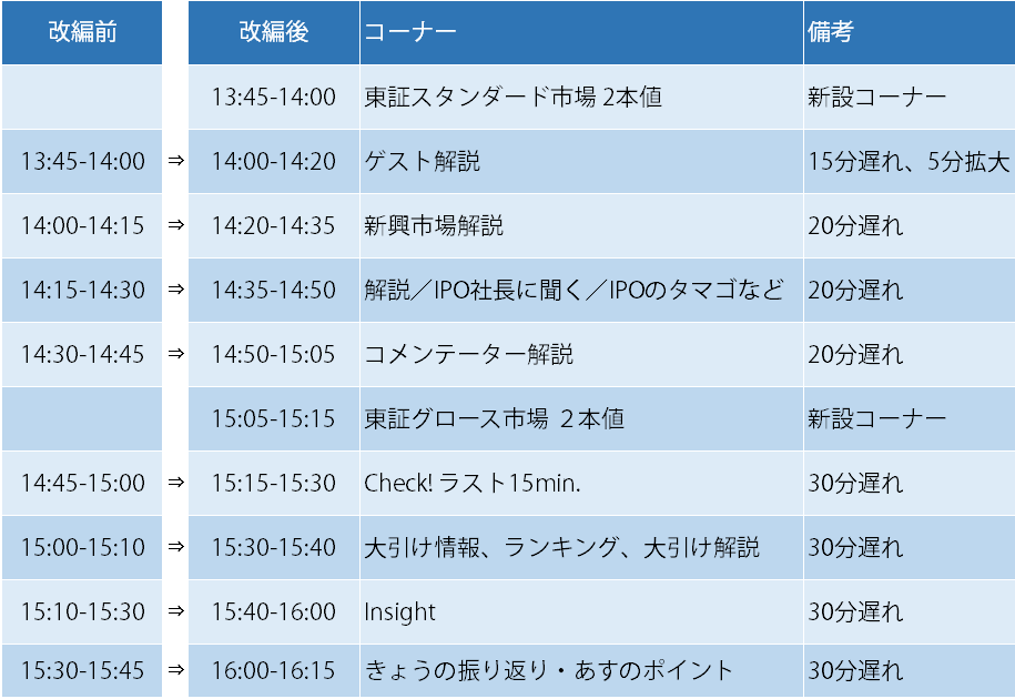 東証が後場の取引終了時刻を15時から15時30分に変更することに伴い、「昼エクスプレス」の終了時刻も現在の15時45分から16時15分に変更して、放送時間を30分延長します。