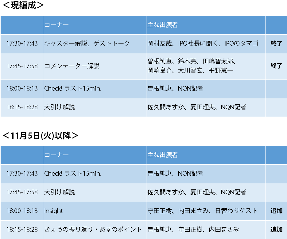 現在「朝エクスプレス」と「昼エクスプレス」で編成している東証プライム市場の全銘柄表示に加えて、11月5日(火)からは、スタンダード市場(13時45分~14時00分)とグロース市場(15時5分~15時15分)の全銘表示を「昼エクスプレス」に編成します。
