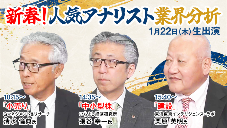 1月22日(木)、人気アナリストが日替わりならぬ「1日がかり」で集結!業界の最前線を読み解く特別企画「新春!人気アナリスト特集」をお届けします。10:15~、14:35~、15:40~の3回、それぞれ異なるテーマで深掘り。プロの分析で新春の相場・業界動向をまとめてチェック!