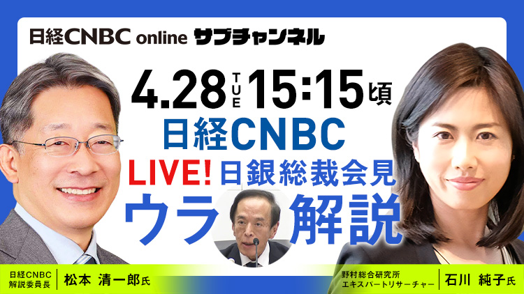 イラン情勢の混迷を受けて日銀が4月に利上げに動くとの予想が徐々に高まってきています。配信では植田和男・日銀総裁の会見を見ながら、石川純子氏(野村総合研究所 エキスパートリサーチャー)と松本清一郎(日経CNBC 解説委員長)が、総裁の発言や経済見通し、記者との問答ににじむ「意図」をチャットライブで読み解きます。